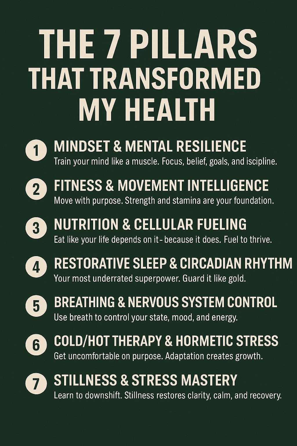This isn’t a one-size-fits-all plan. It’s a framework built around 7 Pillars that I live by daily. These changed my health, my mindset, and my future — and I believe they can do the same for you.